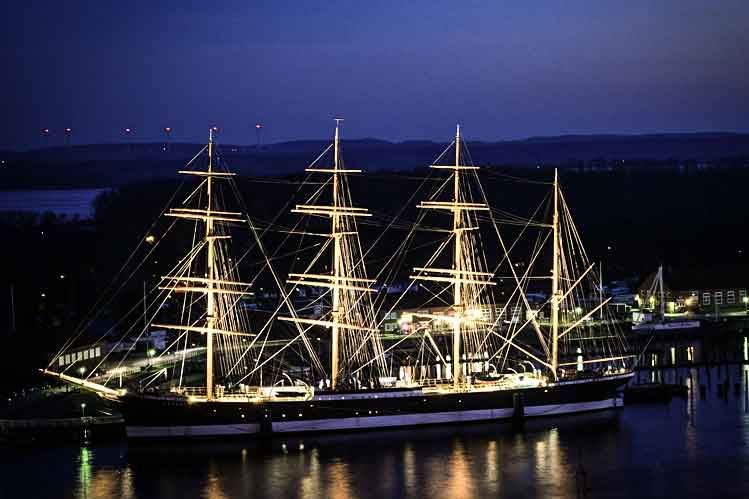 Die schöne "Tochter" Lübecks -das Ostseebad Travemünde- wird durch eine beeindruckende Viermastbark geziert, deren Masten weithin zu sehen sind.
